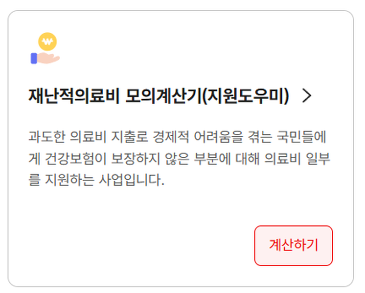 의료비 부담이 큰 상황에서 지원 대상 여부를 확인할 수 있는 모의계산 서비스입니다. 의료비 과다 지출로 인한 경제적 부담을 줄이는 데 유용하게 활용할 수 있습니다.